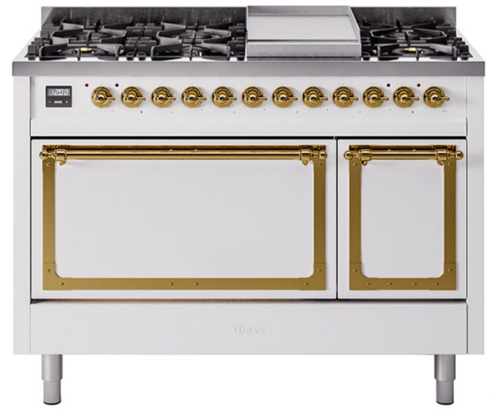 Ilve® Nostalgie II Noblesse 48'' White Pro Style Dual Fuel Range with Brass Trim