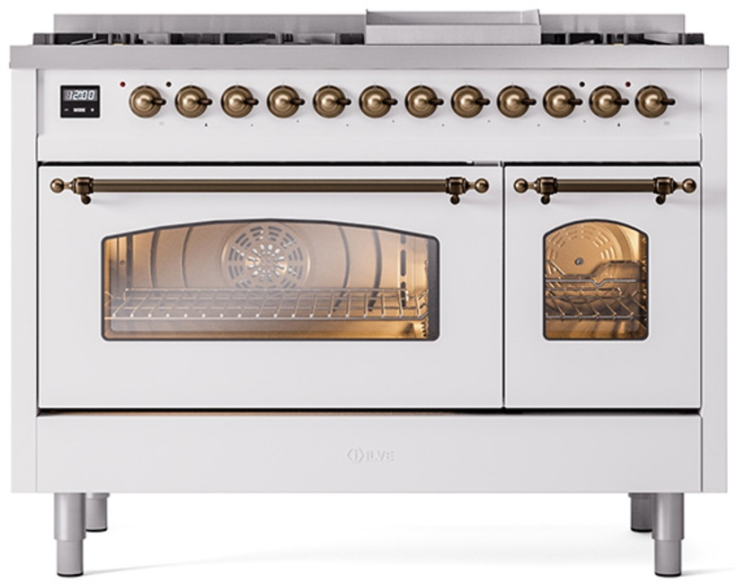 Introducing the new Nostalgie II 48" dual fuel range, a classic addition with a touch of innovation to any kitchen. This range feature sealed burners equipped with total black brass flame spreader that has a non-stick nanotechnological coating, heavy cast iron grates, 3.5 + 1.52 cu. ft. total double oven capacity and soft closing door system.Read More